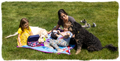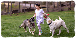 Dogs boarding with us enjoy the freedom of being outdoors and leash-free for most of the day. Whether it’s engaging in play with each other or with us humans, fetching balls, or accompanying us on outdoor adventures, they’re constantly active. For downtime, they can unwind on our shaded deck or lounge on a sofa indoors. You won’t find any crates or kennels in our home.